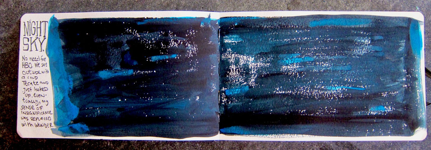 And yet — no matter how dark things get, no matter how many times we have to be dragged back to the same hard lessons — we can still see the mountain. We can still hear the birds. We can still draw the beauty of ordinary things. We can still float in a pool at night and look up and feel, for a moment, that it’s all somehow worth it.